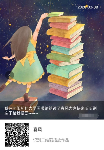 2020年4月23日是第25个“世界读书日”,图书馆在成功举办了“且惜春光好,战疫读书时”读书评比活动和“书香悦读 智赢战疫”疫情知识红包答题活动后,又为您推出了第六季声传华章诵读活动。