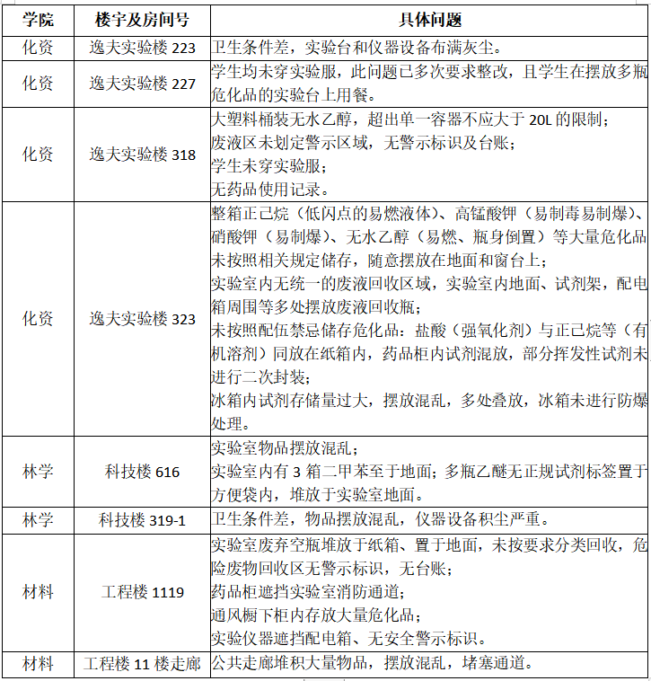 学校决定通报逸夫实验楼223、227、318、323室,科技楼616、319-1室,工程楼1119室,请化资、林学、材料学院对涉及到的教师和学生严肃追责问责,并责令限期整改;请所有实验室举一反三,加强管理,避免同类问题屡禁不绝,反复出现。