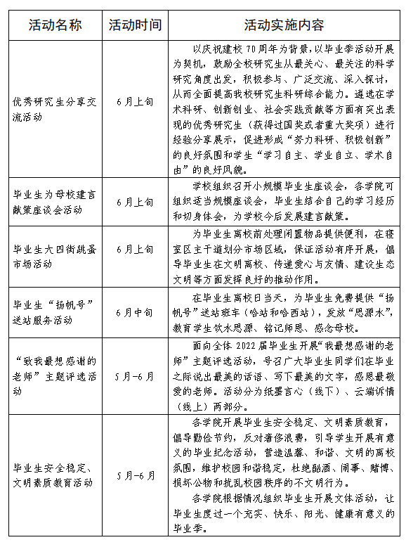 在全校师生喜迎华体会官方网页版70周年校庆之际,为进一步做好2022届毕业生离校前各项工作,积极营造平安、有序、稳定、浓情的毕业氛围,让毕业生在母校师生浓浓的关爱中依依惜别校园,号召毕业生在校庆来临之际以实际行动祝福母校70华诞,特制定2022年毕业季“起航教育计划”,活动安排如下。