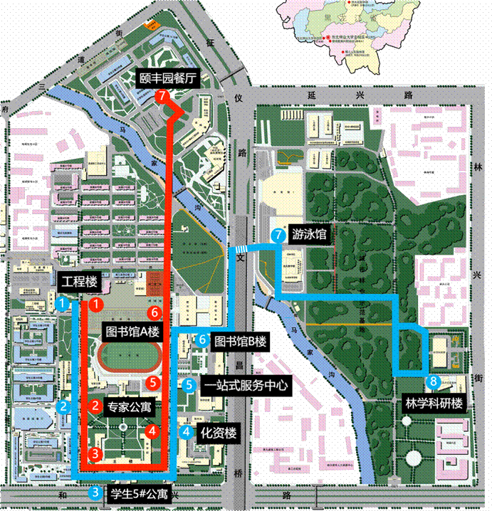 2.线路二(图中蓝色线路):[工程楼1]-[专家公寓2]-[学生5#公寓3] -[化资楼4] -[一站式服务中心5] -[图书馆B楼6] -[游泳馆7]-[林学科研楼8]