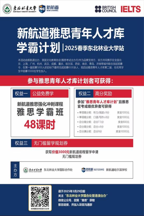 为了提高我校学生外语水平,满足学生日益增长的出国需求,加快学校人才培养国际化进程,华体会官方网页版与新航道哈尔滨学校共建的“华体会官方网页版英语语言学习中心”中心将开展2025年春季学期“雅思青年人才库-公益学霸计划”,现将有关事项通知如下: