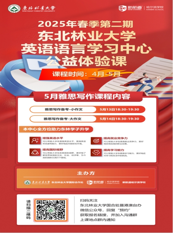 为了提高我校学生外语水平,满足学生日益增长的出国需求,加快学校人才培养国际化进程,华体会官方网页版英语语言学习中心将开展2025年春季第二期英语语言学习公益体验课活动,现将有关事项通知如下: