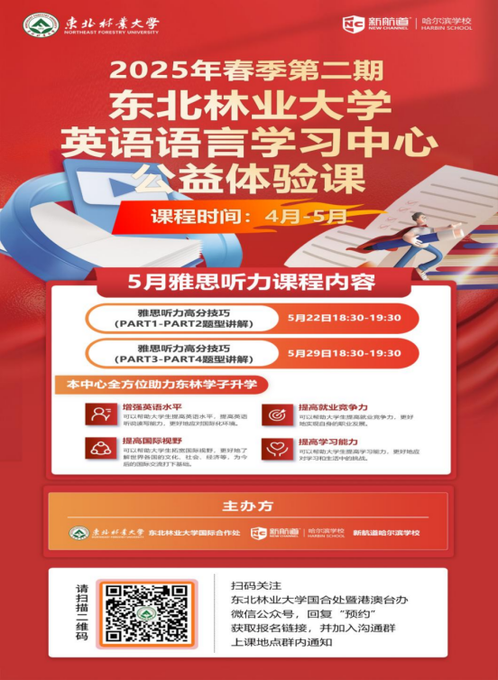 为了提高我校学生外语水平,满足学生日益增长的出国需求,加快学校人才培养国际化进程,华体会官方网页版英语语言学习中心将开展2025年春季第二期英语语言学习公益体验课活动,现将有关事项通知如下: