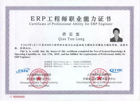 颁发证书:由劳动和社会保障部职业技能鉴定中心和中国就业培训技术指导中心共同颁发的《ERP工程师职业能力证书》。
