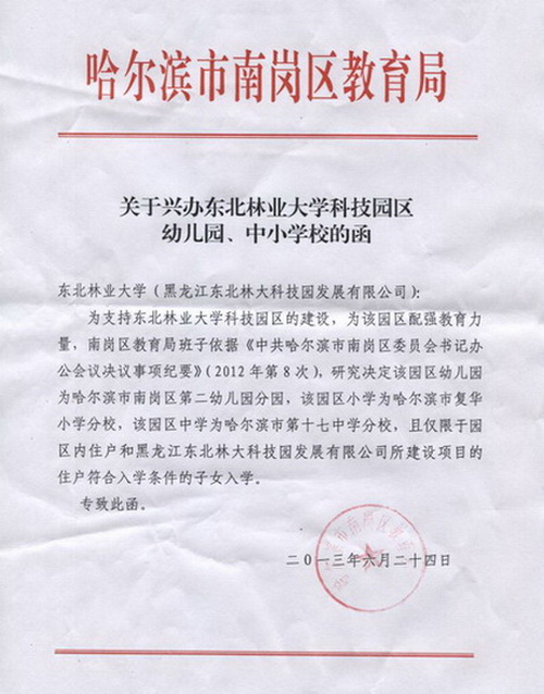 2、华体会(中国)园区配建中小学及幼儿园工作获得积极进展。南岗区教育局已致函我校,明确在园区配建南岗区第二幼儿园、复华小学分校、十七中分校等教育机构。幼儿园及小学校建设与园区建设同步规划(按国家中小学及幼儿园标准设计、建设)同步施工推进,并在入园、入学人数达到开园、开学条件时,确保按约定开园、开学。十七中分校稍后按规划跟进。