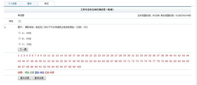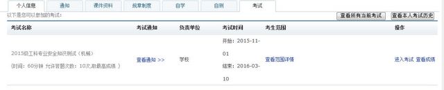 1.考试系统为学生提供学习和掌握安全知识的平台,采取登录系统自学后考试的方式,学生根据系统提供的知识点,结合本专业特点,自主选择时间在系统中自学安全知识,自主选择时间在系统中考试,考试时间为60分钟,可以反复进行考试(最多为10次),成绩在60分以上为合格,系统自动录入最高成绩。