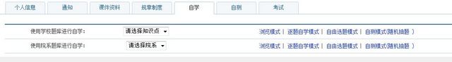 2.进入系统后选择“自学”菜单,“使用学校题库进行自学”点击下拉框选择自学的知识点,可以在“浏览模式、逐题自学模式、自由选题模式、自测模式”任选一种模式进行自学。