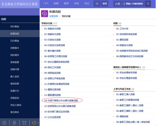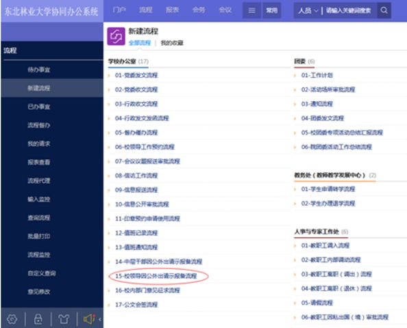 1.校领导因公外出可填写《华体会官方网页版校领导外出请示备案表》(附件1),经相关领导审批后交学校办公室备案;或在协同办公(OA)系统中填报“校领导因公外出请示报备流程”(如图1所示),履行相关备案手续。