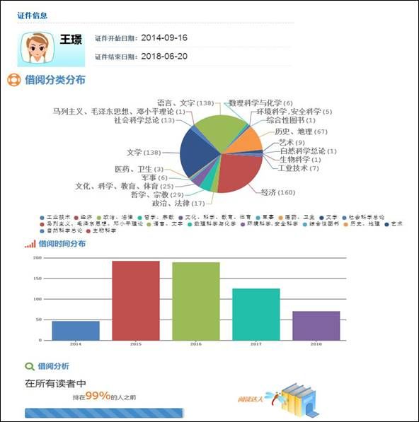 另外,图书馆通过数据挖掘,为所有读者提供个人阅读轨迹展示,读者可用一卡通账号登录到 “我的图书馆”自行查阅、下载自己的借阅历史、借阅分类分布图、借阅时间分布图等数据信息。