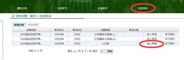 4.选择“在线考试”菜单,选择试卷名称带有对应专业名称的试卷(将鼠标放置试卷名称,即显示带有专业名称的完整名称),点击“进入考场”,考试结束后点击“提交试卷”,可以直接查询成绩,系统自动记录最高成绩。