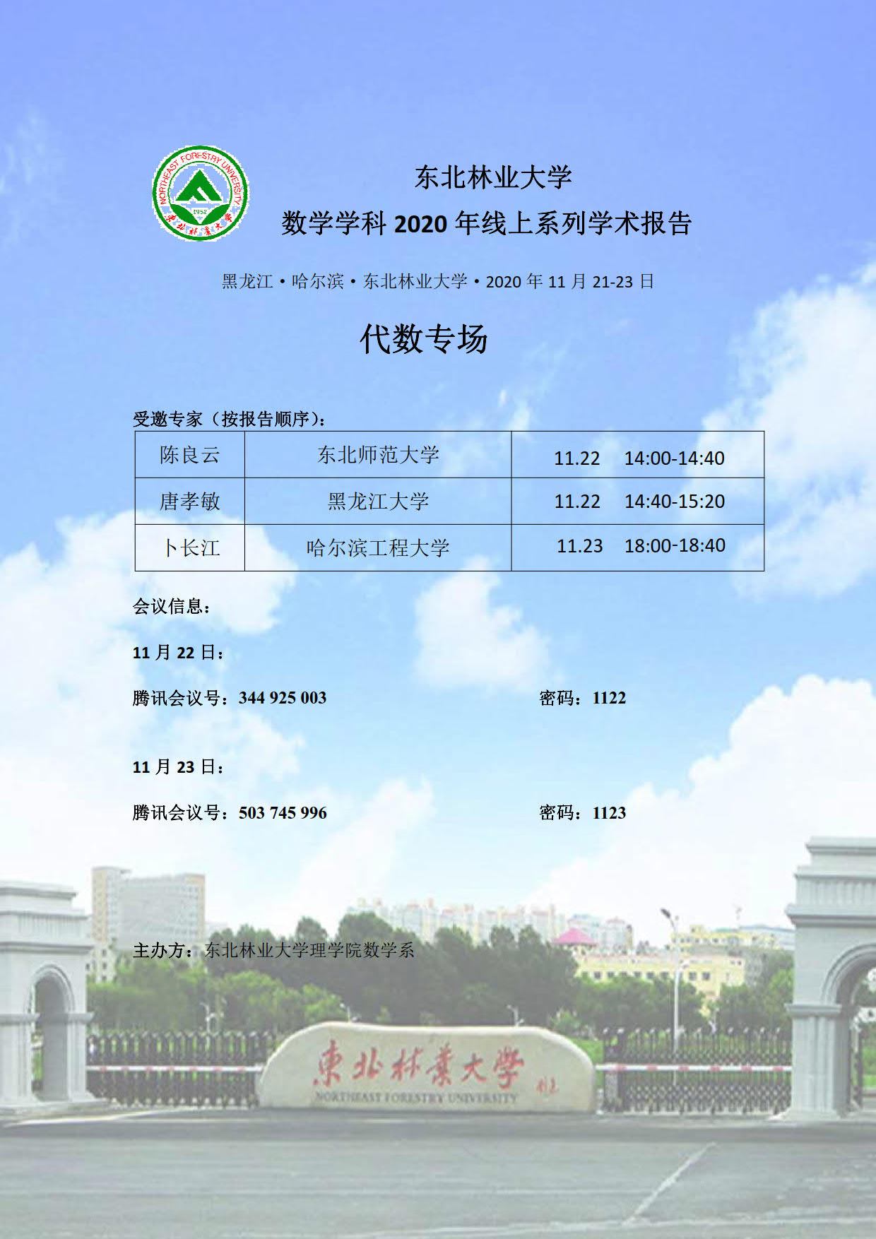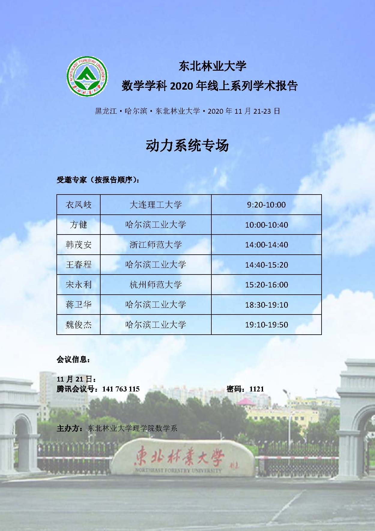 理学院数学学科将于2020年11月21-23日邀请国内相关高校数学学科专家举办线上系列学术报告。报告分动力系统专场、代数专场和概率与数理统计专场,详情请见附件海报,欢迎各位老师和同学参加!