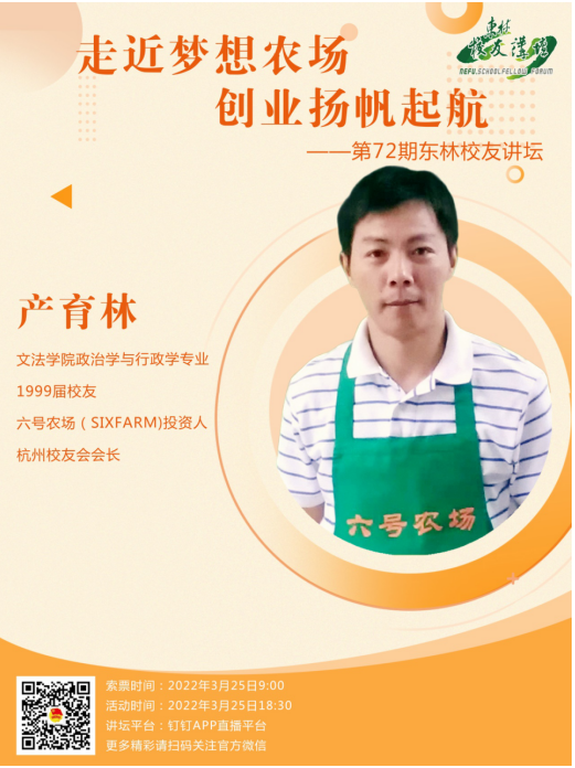 本期校友讲坛,产育林校友将结合自身“梦想农场”创业经历,深情讲述他长期创业的所感所悟,分享他对大学生未来创业、就业的独特见解和深刻认识。欢迎广大师生届时参加!