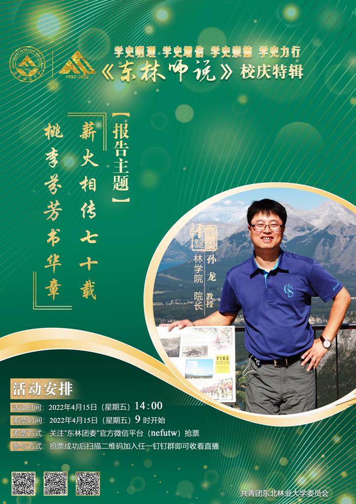 孙龙院长将分享自身工作学习经历,分享在学校70年发展历程中,林学院筚路蓝缕、砥砺奋进的光辉历史,向广大师生校友讲述林学院建院以来的艰苦创业、拼搏奋斗的故事,介绍林学院老一辈创业者、建设者的突出贡献和新时代林学院的办学成就,阐述在新一轮一流学科建设的背景下,林学院的发展规划和目标,引领广大青年师生为学校跨越式发展贡献林学智慧和力量!