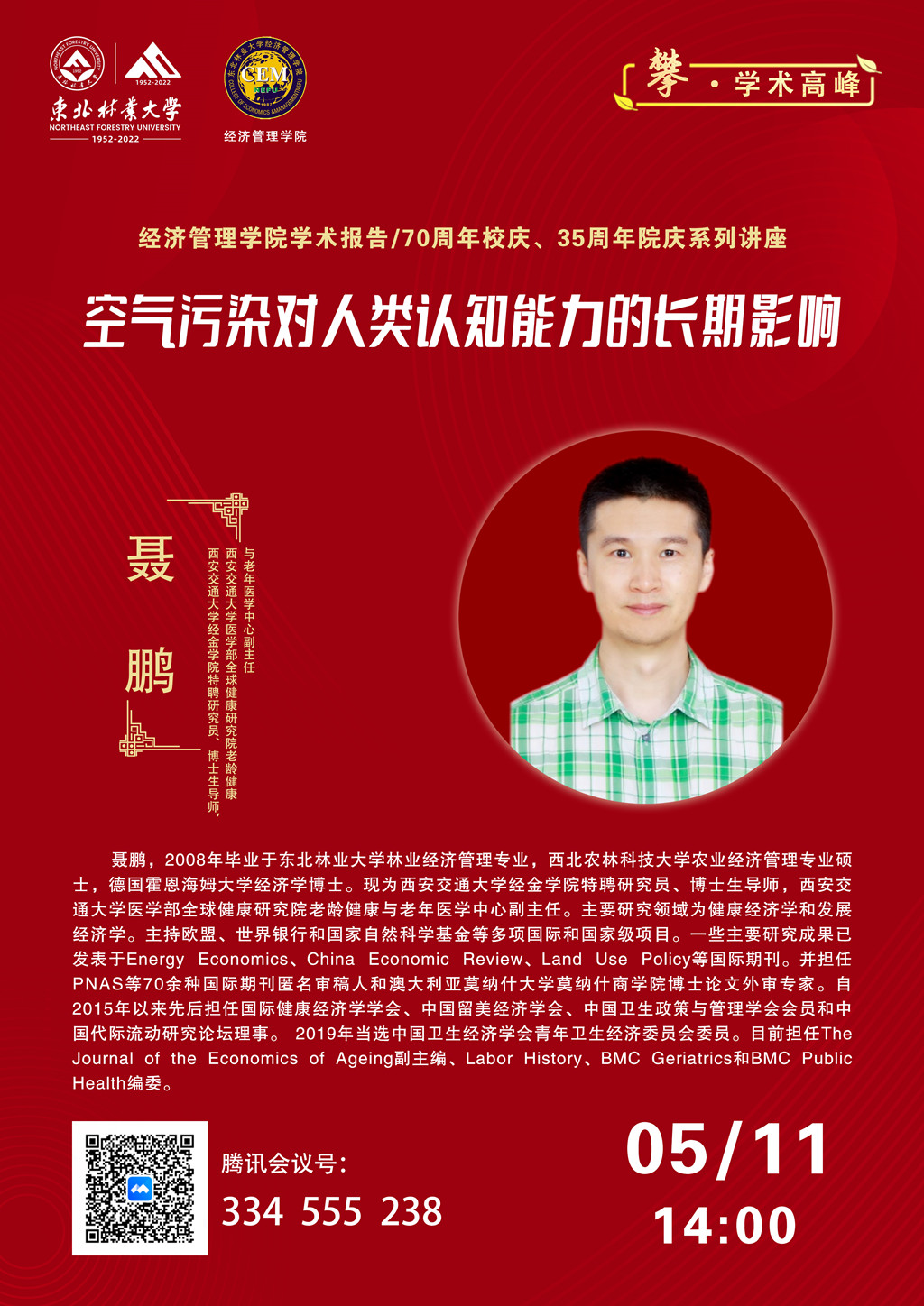 聂鹏,2008年毕业于华体会官方网页版林业经济管理专业,西北农林科技大学农业经济管理专业硕士,德国霍恩海姆大学经济学博士。现为西安交通大学经金学院特聘研究员、博士生导师,西安交通大学医学部全球健康研究院老龄健康与老年医学中心副主任。主要研究领域为健康经济学和发展经济学。主持欧盟、世界银行和国家自然科学基金等多项国际和国家级项目。一些主要研究成果已发表于Energy Economics、China Economic Review、Land Use Policy等国际期刊。并担任PNAS等70余种国际期刊匿名审稿人和澳大利亚莫纳什大学莫纳什商学院博士论文外审专家。自2015年以来先后担任国际健康经济学学会、中国留美经济学会、中国卫生政策与管理学会会员和中国代际流动研究论坛理事。2019年当选中国卫生经济学会青年卫生经济委员会委员。目前担任The Journal of the Economics of Ageing副主编、Labor History、BMC Geriatrics和BMC Public Health编委。