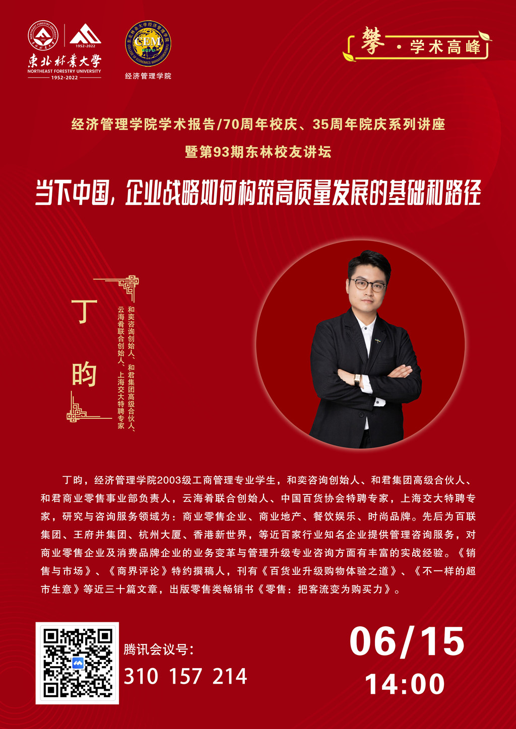 丁昀,经济管理学院2003级工商管理专业学生,和奕咨询创始人、和君集团高级合伙人、和君商业零售事业部负责人,云海肴联合创始人、中国百货协会特聘专家,上海交大特聘专家,研究与咨询服务领域为:商业零售企业、商业地产、餐饮娱乐、时尚品牌。先后为百联集团、王府井集团、杭州大厦、香港新世界,等近百家行业知名企业提供管理咨询服务,对商业零售企业及消费品牌企业的业务变革与管理升级专业咨询方面有丰富的实战经验。《销售与市场》、《商界评论》特约撰稿人,刊有《百货业升级购物体验之道》、《不一样的超市生意》等近三十篇文章。出版零售类畅销书《零售:把客流变为购买力》。