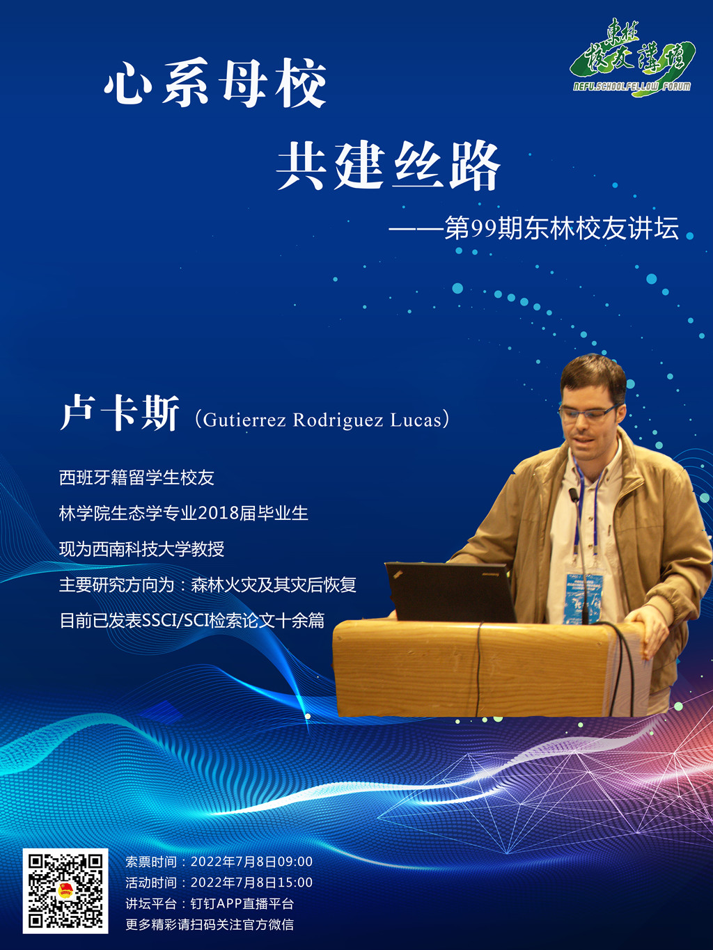 卢卡斯(Gutierrez RodriguezLucas),西班牙籍2018届林学院生态学专业毕业生,现任西南科技大学教授。主要研究方向为:森林火灾及其灾后恢复,已发表SSCI/SCI检索论文10余篇。2019~2021年在西班牙马德里自治大学东方研究中心担任汉语教师,致力于中国文化在西班牙的传播和两国之间的教育交流工作。
