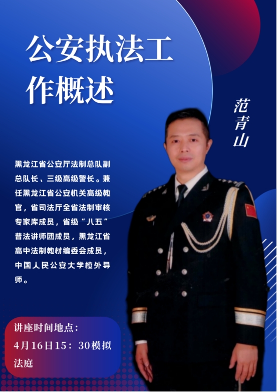 范青山,黑龙江省公安厅法制总队副总队长、三级高级警长。兼任黑龙江省公安机关高级教官,省司法厅全省法制审核专家库成员,省级“八五”普法讲师团成员,黑龙江省高中法制教材编委会成员,中国人民公安大学校外导师。