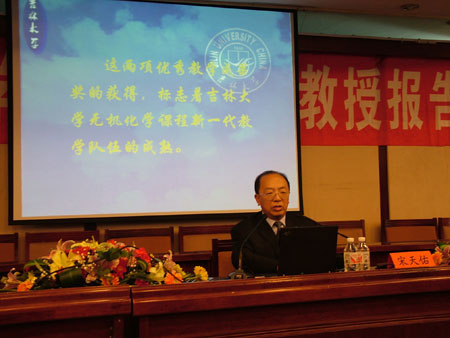 宋天佑教授以吉林大学的无机化学为载体,通过实例,讲述了五个方面的内容:一、教学工作要持之以恒;二、教学团队建设;三、教材建设;四、多媒体与课堂教学;五、教学工作的环境支持。宋教授认为,一门课程的教学建设,需要十几年甚至几十年的时间,需要几代教师为之努力奋斗。建设好一支一流的年龄结构合理、教学效果好、爱岗敬业的教学团队至少要做到两点:1、有意识、有目的地培养年轻教师;2、重视发挥经验丰富的老教师的“传、帮、带”作用。教材建设上,要实现“立体化、系统性、多层次、高质量”的建设发展,体现在纸质教材与多媒体教学资源的配合使用,理论课教材与实验课教材、习题课教材的结合等。在多媒体与课堂教学方面,宋教授重点讲述了课堂教学在教育工作中的重要地位,以他个人备课和修改多媒体课件的亲身体验,鲜活地向我们展示了一名优秀教师钻研授课方法、改进教学手段的执着与艰辛。当我们听到宋教授主讲无机化学课程19轮,每一轮的教案都是不同的,每一节课的教案都是新写的,以及宋教授为了不影响课堂教学在上课前排除一切干扰连一封信都要在课后再拆等事例时,许多人的眼睛都湿润了,宋教授在报告中提到过多次,教师要以其人格魅力影响学生,要用教师的敬业精神在潜移默化中教育学生。大家深深地被宋教授的敬业精神所感染,透过这位严谨朴实、亲切和蔼的老教授,看见了“人民教师”四个字在闪闪发光。