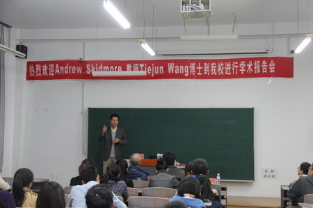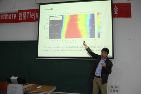 汪铁军博士则以自己的亲身经历作为主线,介绍了自己在ITC读博士阶段的研究成果《Tracking animal migration from space》,分析了基于遥感技术和GIS的秦岭大熊猫栖息地竹子分布问题和不同季节大熊猫的栖息、迁移的相互关系,以及食草水鸟的迁徙特点,其研究成果已经在多家国际知名杂志发表。汪铁军博士在讲述自己丰富却艰辛的工作经历时,多次强调“Nothing is impossible!”,以此激励在场同学,引起了同学们的强烈共鸣。最后,Andrew Skidmore教授和汪铁军博士在一片热烈的掌声中结束了他们精彩的报告。