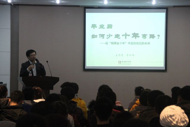 活动伊始,伴随着热烈的掌声,戴欣明老师闪亮登场。戴老师用诙谐幽默的语言开始了精彩的演讲,讲到个人经历的时候,谈到自己喜遇贵人。戴老师说:“路不是摸索出来的,是贵人告诉你的。”未来十年同学们将会面临什么样的环境?社会需要什么样的人才?如何理解“新黄金十年”?成功定位自己的三个思考层面是什么?毕业三条职业选择之路是什么?我们应该如何利用学校这几年时光?对于以上问题,戴欣明老师一一讲述了自己的观点,并结合自己的职业生涯给出了很多建议。其中不乏很多独具特色的故事,使同学们心领神会。少走弯路,节省十年时间就相当于延续了有意义的生活,会让我们的未来更加丰富多彩。