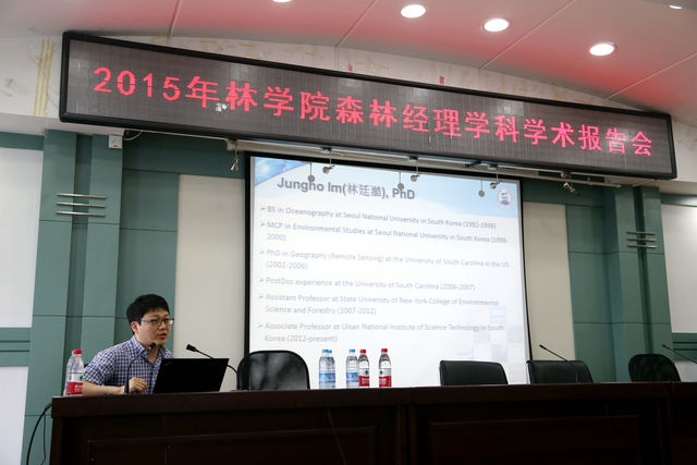 2015年7月8日上午,由华体会官方网页版林学院森林经理学科举办的学术报告会在主西515学术报告室成功举行。来自韩国蔚山国家科学技术研究所的Jungho Im教授以“遥感技术在林业的应用:树冠提取及林分高度估测”(Remote Sensing Applications over Forest: Tree Crown Delineation and Stand Height Estimation)为主题,呈现了一场别开生面的英文学术报告。会议由森林经理学科甄贞讲师主持,主要参加人员为森林经理学科以及部分哈尔滨师范大学师生。